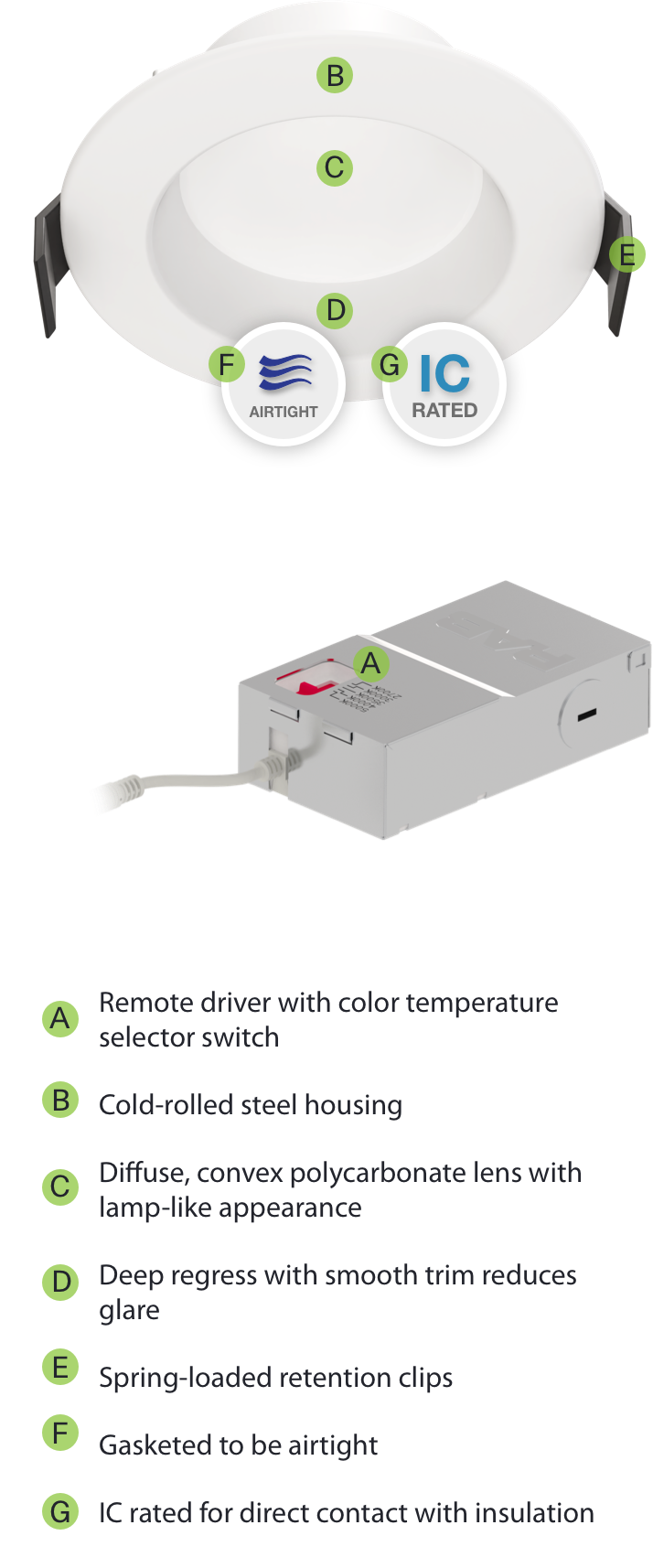 All models use a 120V driver with TRIAC dimming down to 10%. 90+ CRI comes standard for accurate color rendering.