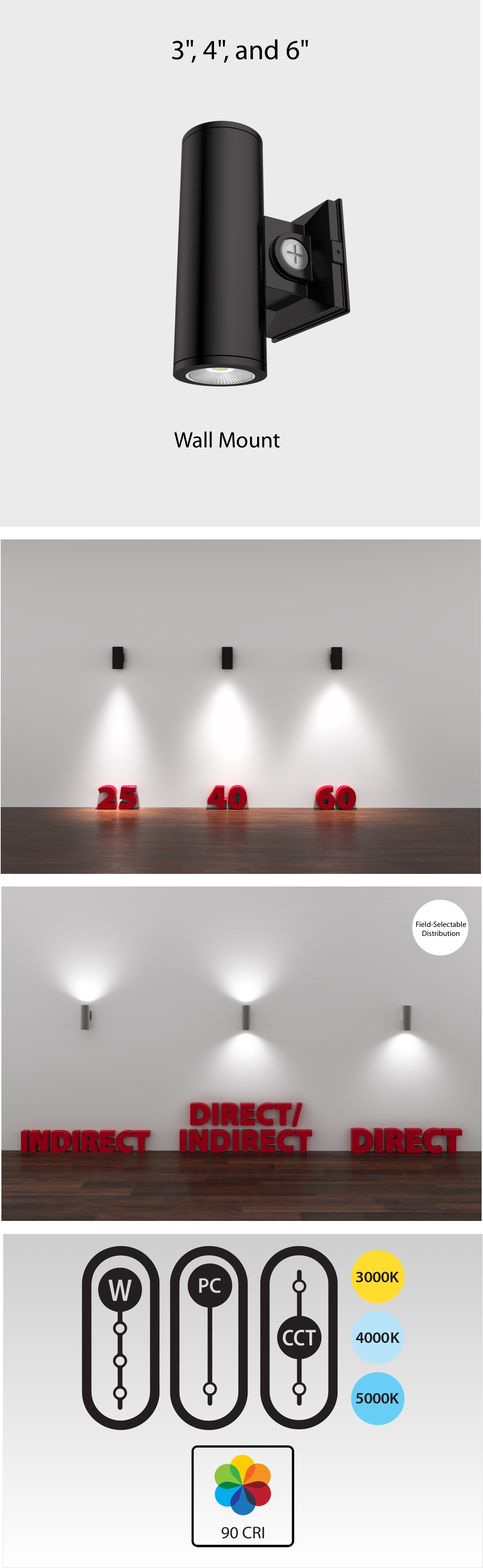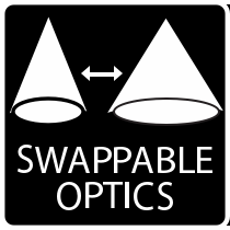 *3" models come standard with 25° optics, 4" come with 40°, and 6" come with 60°. Accessories are available for all sizes in all three distributions.
