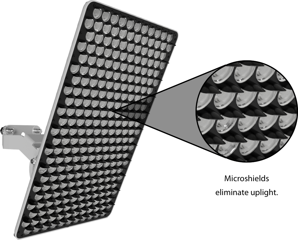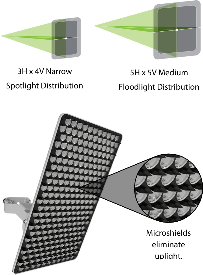 The 5000K GameOn model has a large, unified panel that delivers up to 67,000 lumens and can be ordered with a narrow spotlight distribution (3H x 4V) or a wider floodlight spread (5H x 5V). The innovative design includes small microshields that help block uplight and reduce light trespass.