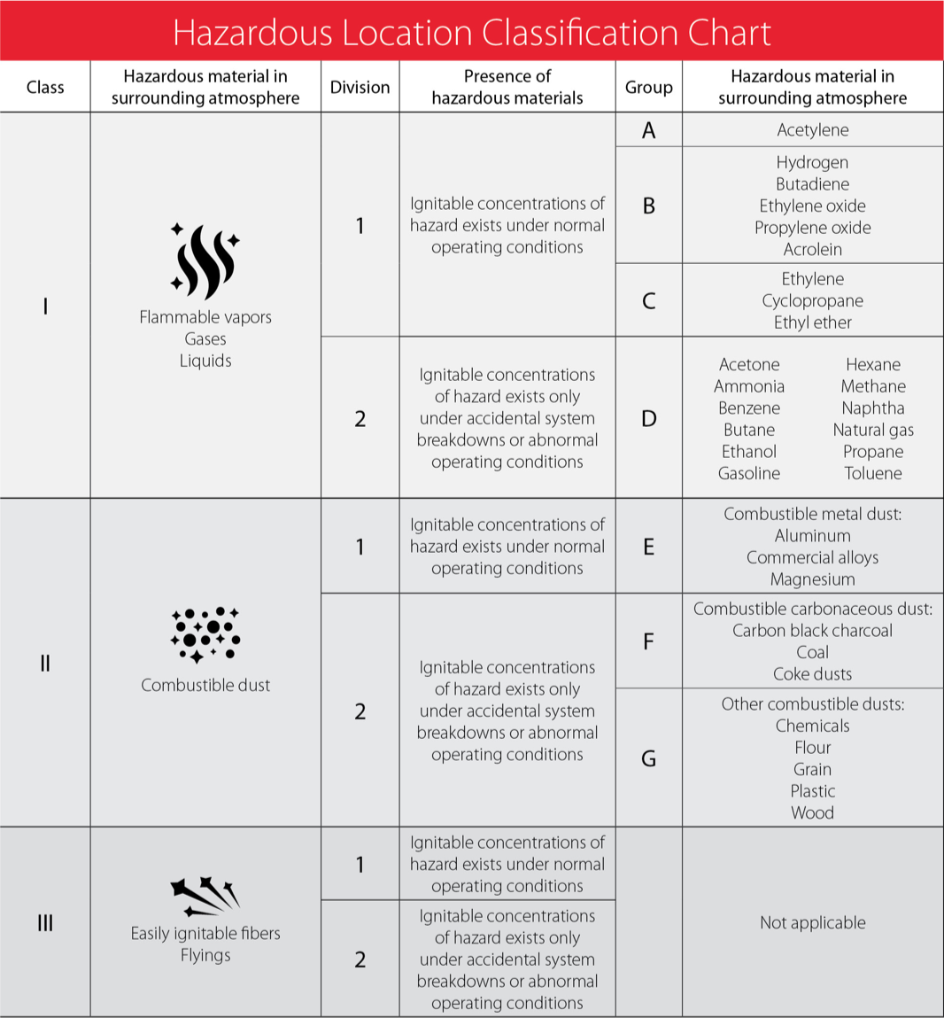• Class 1 Division 1 (Groups C & D), T6 or T5 (check model)
