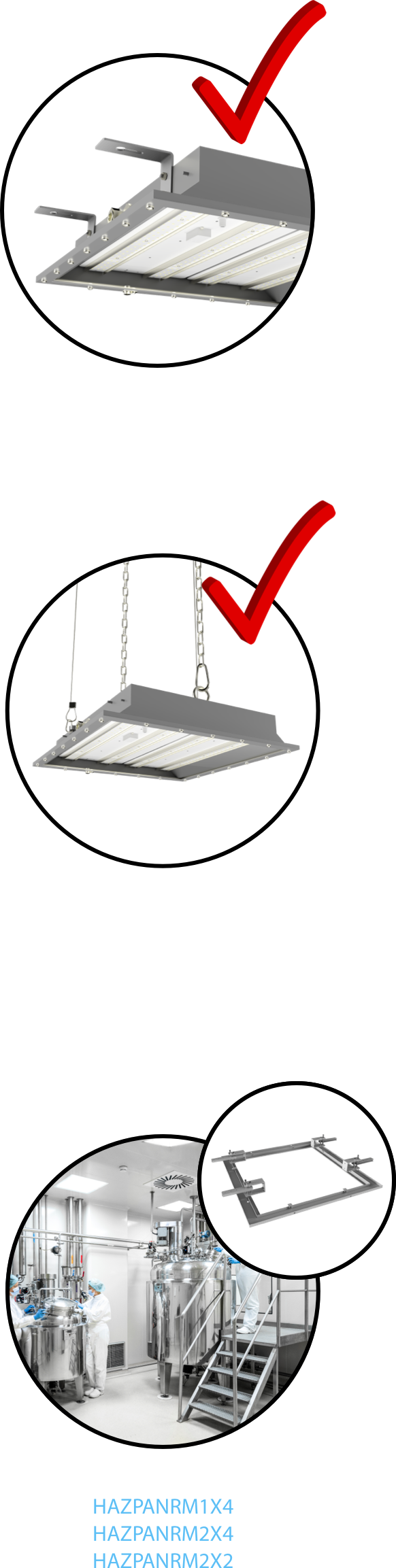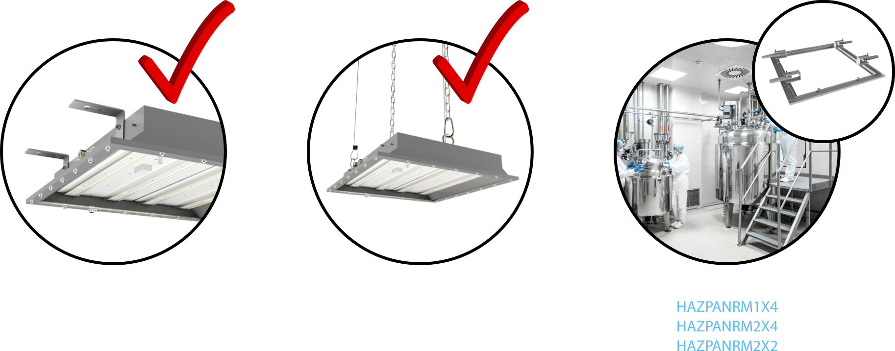 The HAZPAN comes standard with both suspension chains and ceiling mount brackets out of the box, with aircraft cable tethers included for additional support. A mounting kit is also available for recessed use in a ceiling or grid.