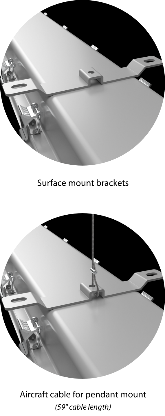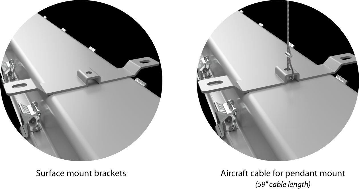 All models come standard with two mounting options—stainless steel, surface mount brackets or aircraft cable for pendant mount—that resist vibrations and ensure safe operation.