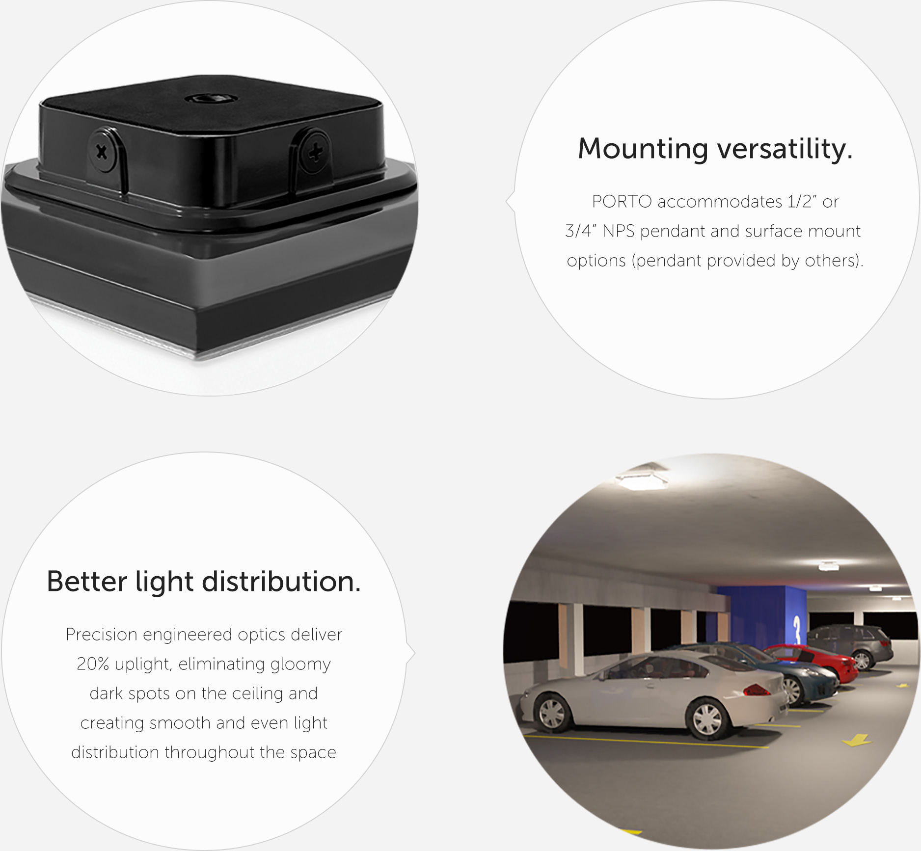 PORTO is built to stand up to the toughest garages. With vandal resistant construction and high transmission polycarbonate lenses, these fixtures will give you optimized light output, eliminate glare, and will last a really long time.