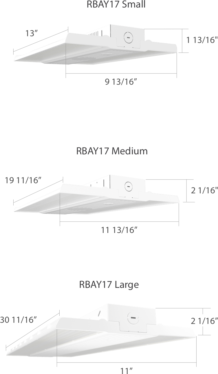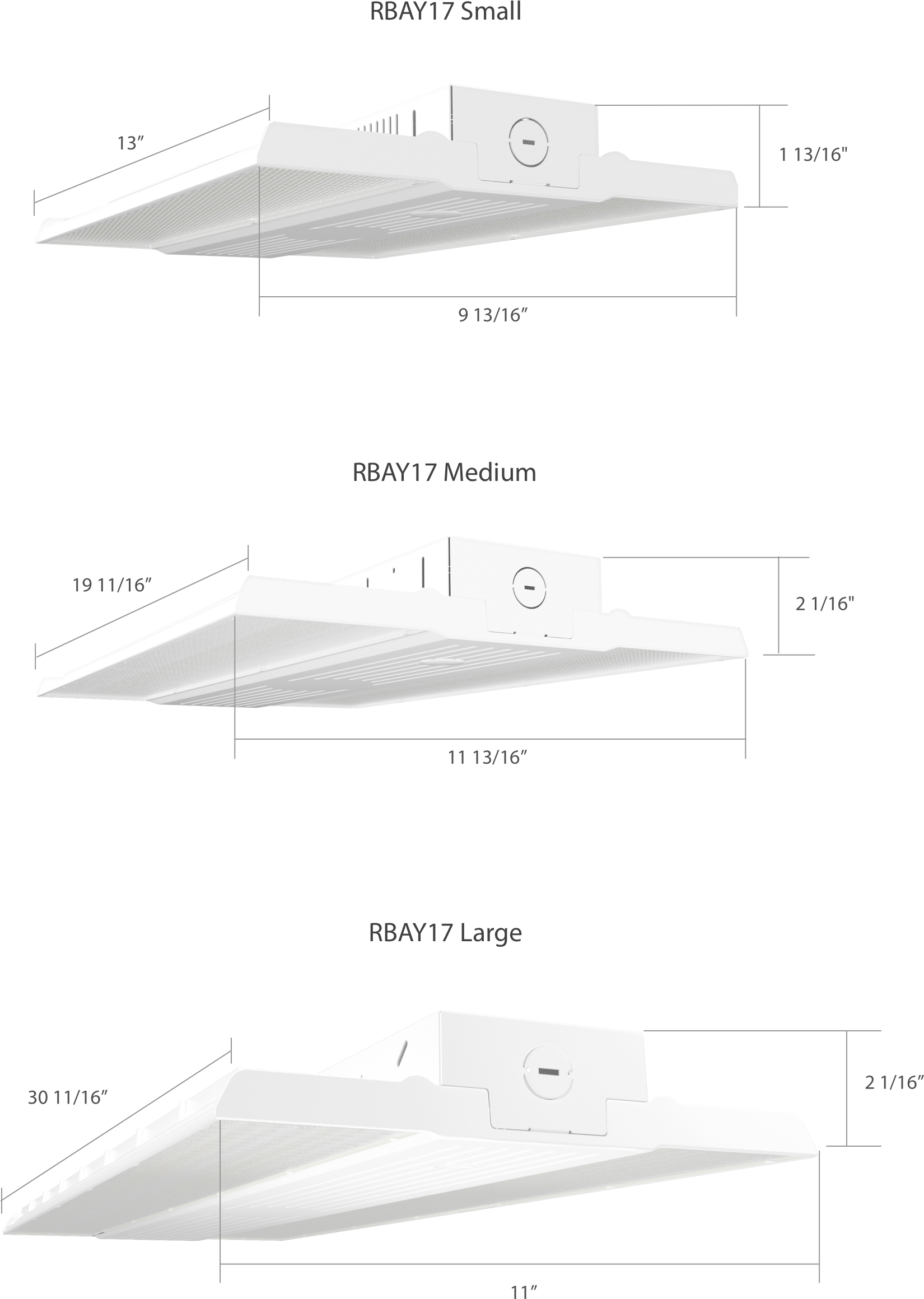 Designed to replace up to 1000W MH and be mounted as high as 60 feet, the RBAY17 family does more with less, hitting the lumen output of much larger high bay fixtures. The RBAY17's size reduction makes for a product that cuts down on materials, consumes less energy to manufacture, and demands less fuel to transport.