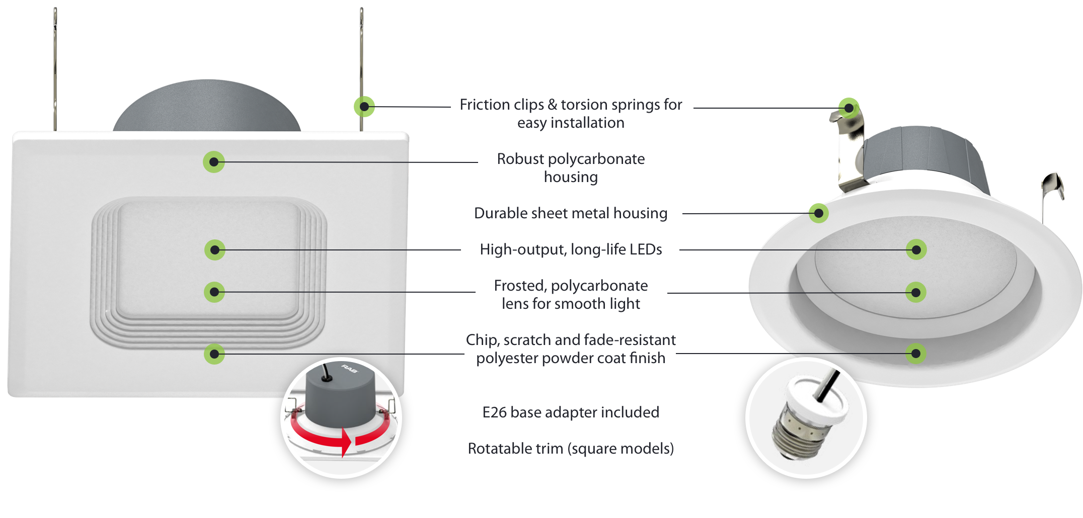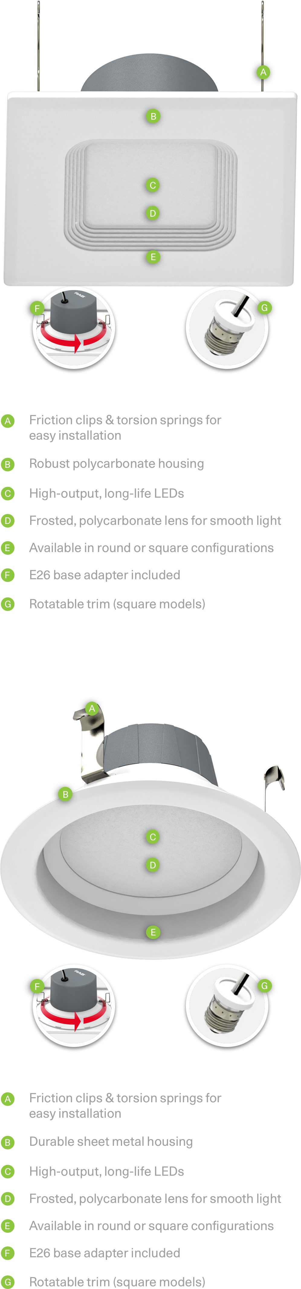Our low-profile design makes them compatible with most recessed housings, and installation is quick and easy, with friction clips for 4” cans, and torsion springs for 5”/ 6” cans. All models also include an Edison base adapter.