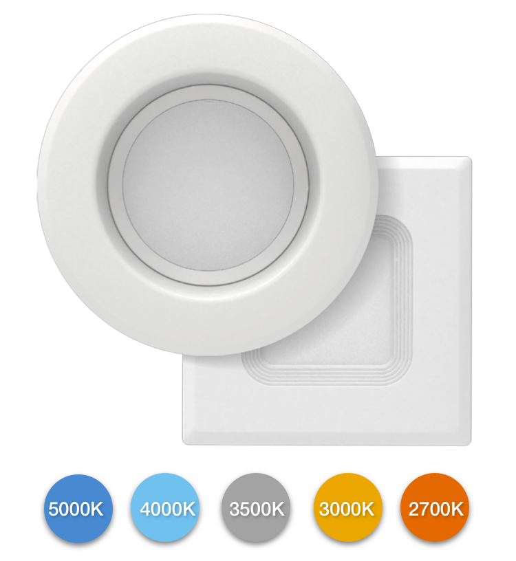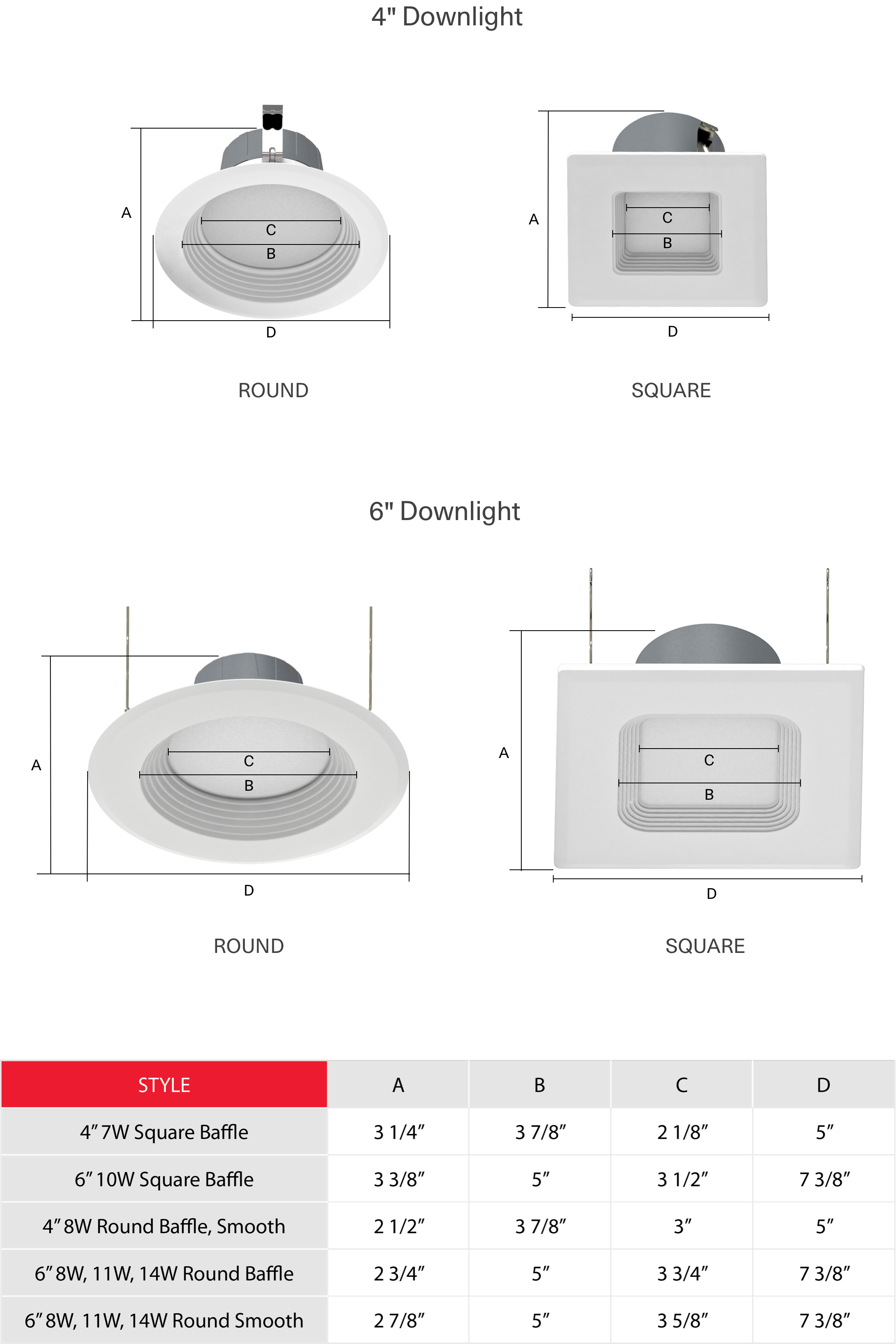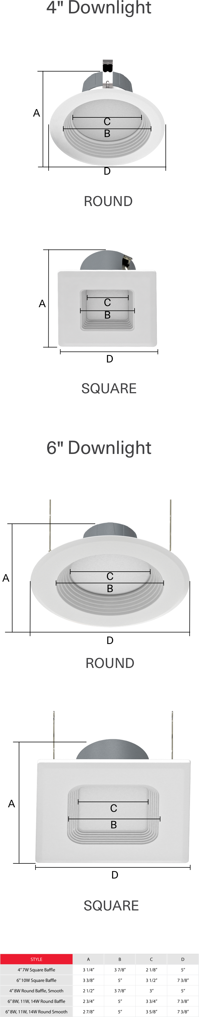 These popular retrofit downlights are ideal for both new construction and retrofit applications. Models are offered in 4” and 6”, with round or square trims, and in five color temperatures. Both shapes are available with baffled trims , and round are also available with smooth trims.