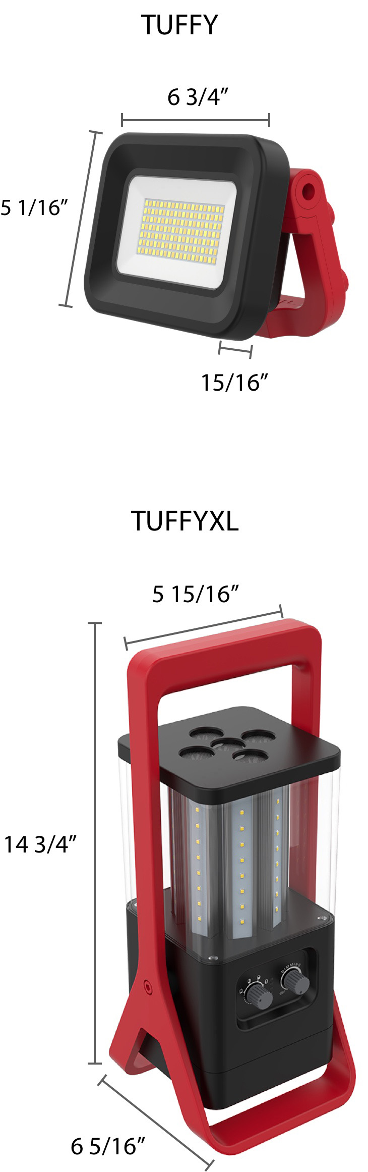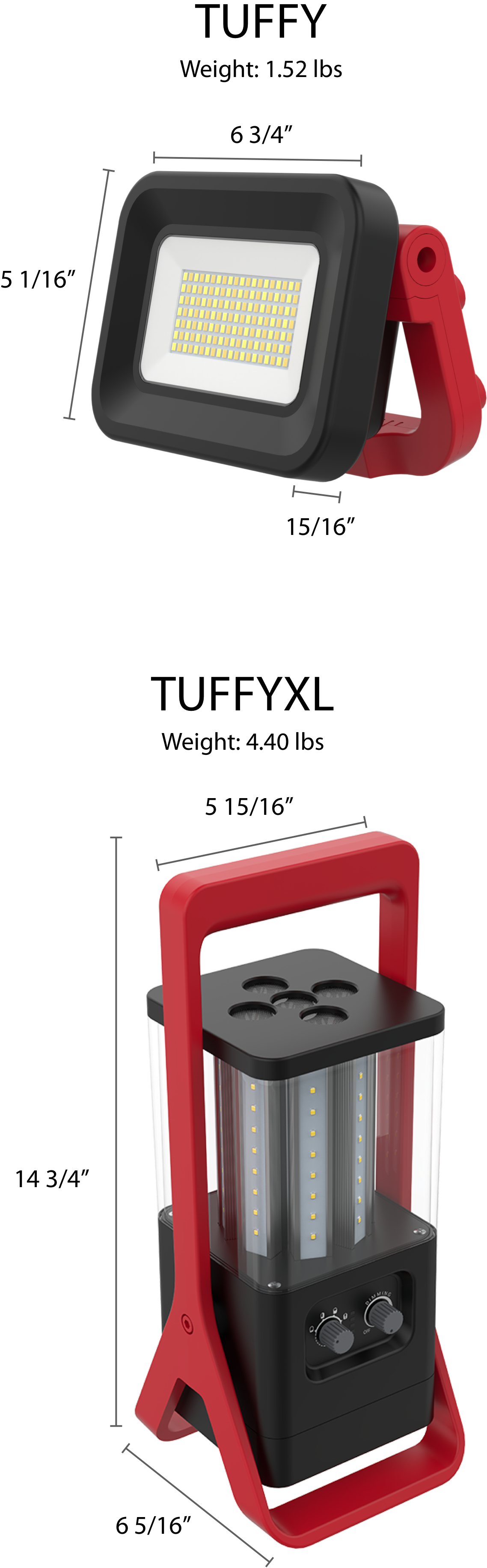 Unlike competitive products that dim as the battery dies, TUFFY delivers consistent, full-brightness output throughout the battery’s charge. The TUFFY model can last up to 8 hours on one charge and the TUFFYXL can last up to 12 hours—no fade, no compromise.