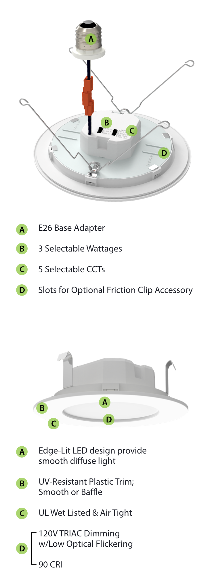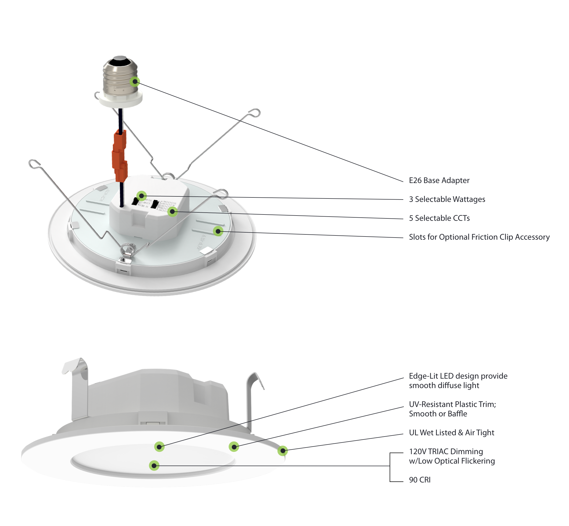 The WFRETRO installs like any standard retrofit downlight. Simply remove the old bulb or trim, screw the Edison base adapter into the socket, and lock in place with torsion springs or friction clips. (Fits most 4" and 5/6" cans)