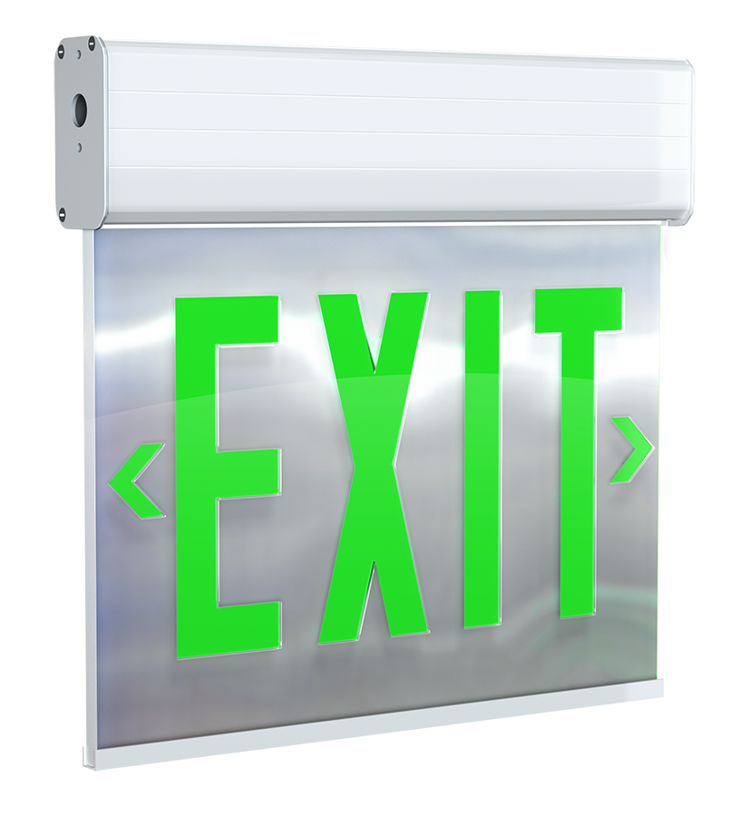 Edge-Lit Exit Sign Unv Faces Green Letters Mirror Panel Battery Backup White
